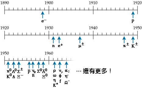 | 1933-34 | ���t�q��(Hideki Yukawa)���X�۹�שM�q�l�z�ץH��l�M���l���s�ɤl���洫(���l�s"�k���l")�y�z��l�֪��椬�@�ΡA���t�q������ɤl����q(���l)�j���O�q�l��q��200���A�o�O��l�֤O���l�z�ת��}�ݡC |