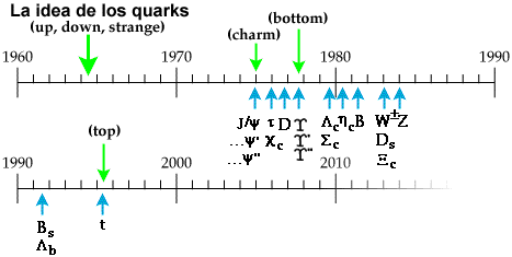 Murray Gell-Mann y George Zweig introdujeron la idea tentativa de los quarks. Sugirieron que los mesones y los bariones están compuestos por quarks o antiquarks de tres tipos, llamados up, down y strange (u, d, s), con spin 1/2 y cargas eléctricas 2/3, -1/3, -1/3, respectivamente (resulta que esta teoría no es completamente exacta). Ya que estas cargas nunca han sido observadas, la introducción de los quarks fue tratada como una explicación matemática de los patrones de sabor, seguidos por las masas de las partículas, más que como un postulado de existencia de objetos físicos reales. Más tarde, los desarrollos teóricos y experimentales, nos permitieron considerar a los quarks como objetos físicos reales, aunque no puedan ser aislados. |