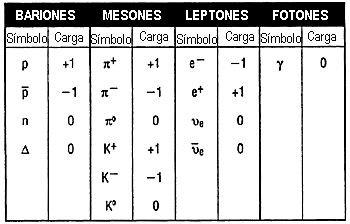 Note que las antipartículas están indicadas, en algunos casos, mediante una barra colcada encima del nombre de la partícula (e.g., p-barra = antiprotón, nu-barra sub-e = neutrino del antielectrón); en otros casos están indicadas simplemente por el signo de las cargas (e- = electrón, e+ = positrón = antielectrón); pi+ y pi- son partícula y antipartícula respectivamente, y en forma similar, K+ y K-. Una antipartícula posee la misma masa que su correspondiente partícula, pero todas sus cargas tienen valor opuesto.